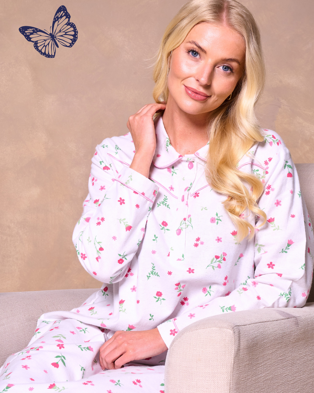 A traditional and timeless flannel nightie. Our long sleeved nightdress in a super cosy 100% brushed cotton with pretty pink or blue floral heart print. It has a 3 button yoke and Peter Pan collar edged in co-ordinated piping. It is wonderful gift idea for Mum or Gran.